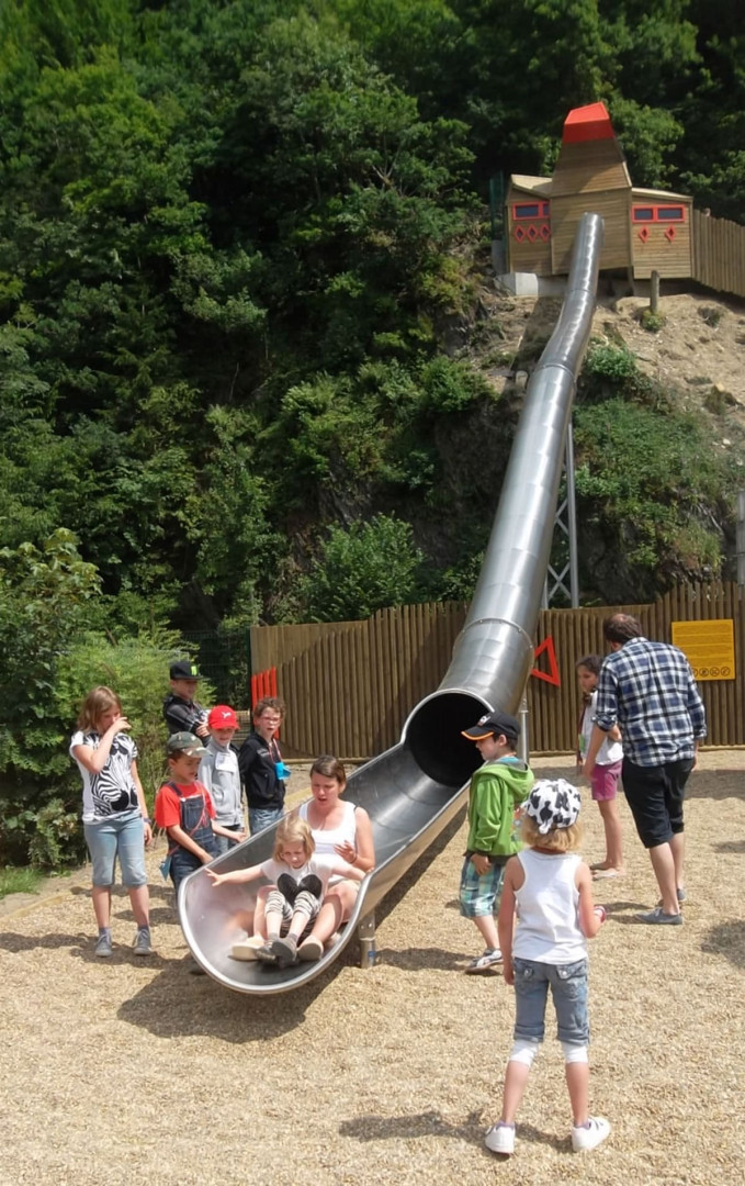 Adaptée à tous les âges, la plaine extérieure qui prend place dans un méandre de l’Ourthe est un lieu de défoulement et de jeux.